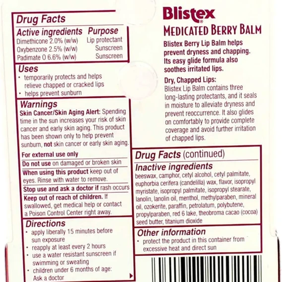 Blistex Berry Lip Balm is designed to seal in moisture, offering smooth and easy-gliding protection to soothe and prevent dry lips. With three long-lasting protectants, it helps prevent dryness and chapping, providing complete coverage for irritated lips. Additionally, the SPF 15 protection aids in preventing premature signs of aging, freckling, uneven coloration, and potential sun-related health risks. Keep in mind that lips don't tan but can burn, making regular use crucial for sun protection.