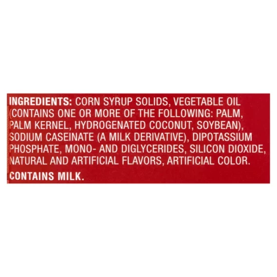 CORN SYRUP SOLIDS, VEGETABLE OIL CONTAINS ONE OR MORE OF THE FOLLOWING: PALM, PALM KERNEL, HYDROGENATED COCONUT, SOYBEAN), SODIUM CASEINATE (A MILK DERIVATIVE), DIPOTASSIUM PHOSPHATE, MONO- AND DIGLYCERIDES, SILICON DIOXIDE, NATURAL AND ARTIFICIAL FLAVORS, ARTIFICIAL COLOR