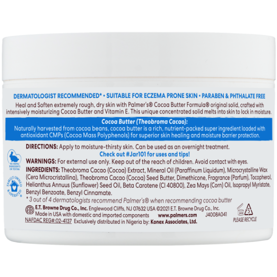 Heal and Soften extremely rough, dry skin with Palmer's Cocoa Butter Formula Original Solid, crafted with intensively moisturizing Cocoa Butter and Vitamin E. This unique concentrated solid melts into skin to lock in moisture. Proudly made in U.S.A., Palmer's® has been a trusted brand for over 180 years, providing high-quality natural products that are passed down from generation to generation. America's #1 Cocoa Butter brand Palmer's Cocoa Butter Formula uses the highest quality natural ingredients for superior moisturization head-to-toe.