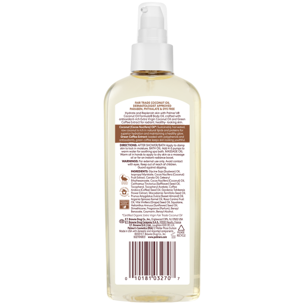Hydrate and Replenish skin with Palmer's Coconut Oil Formula Body Oil, crafted with antioxidant-rich Extra Virgin Coconut Oil and Green Coffee Extract for radiant, healthy-looking skin.